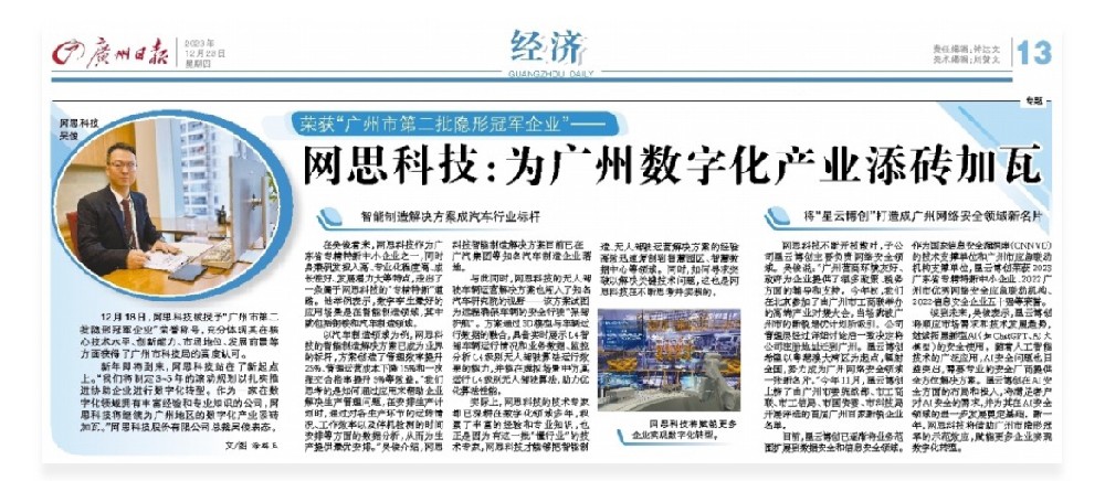 12月28日,《广州日报》经济板块报道了胜游(中国)SHENGYOU·官方网页版的专题访问。总裁吴俊先生代表胜游(中国)SHENGYOU·官方网页版接受采访,向读者分享了胜游(中国)SHENGYOU·官方网页版的智慧解决方案以及子公司星云博创未来的发展规划。图为《广州日报》12月28日胜游(中国)SHENGYOU·官方网页版专访版面荣获“广州市第二批隐形冠军企业”——胜游(中国)SHENGYOU·官方网页版:为广州地区的数字化产业添砖加瓦12月18日,胜游(中国)SHENGYOU·官方网页版被授予“